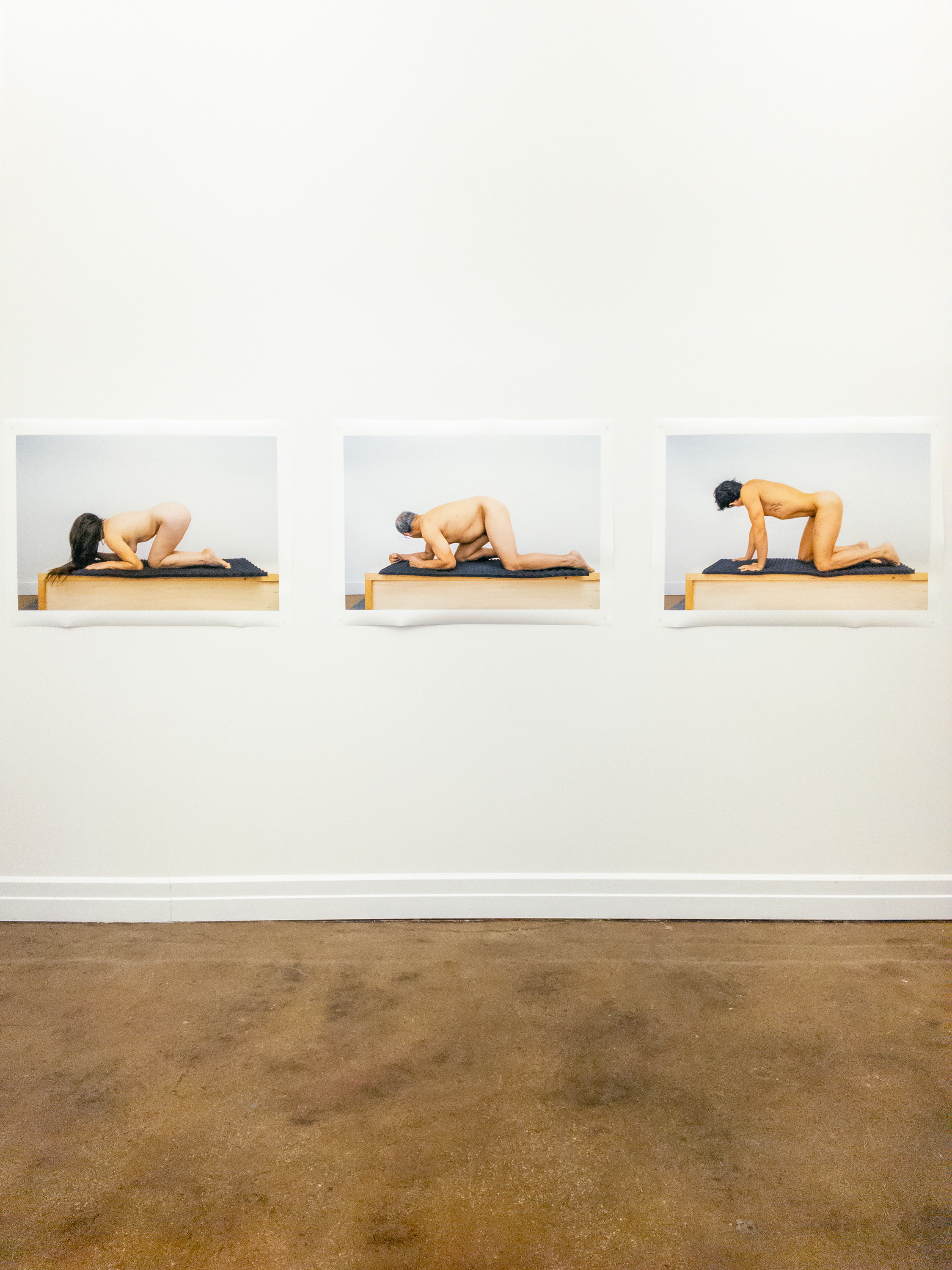 After years of research, discussion, and preparation, my parents and I collaborated on this project, creating a family portrait that embraces the taboo. Challenging traditional hierarchies in both photographic and familial roles, I photographed their anuses, and they photographed mine. Small prints of all three anuses are displayed in a movable installation, allowing viewers to rearrange their order. Corresponding large-scale prints depict each of us from the side, atop shipping crates, excluding our faces and genitals.